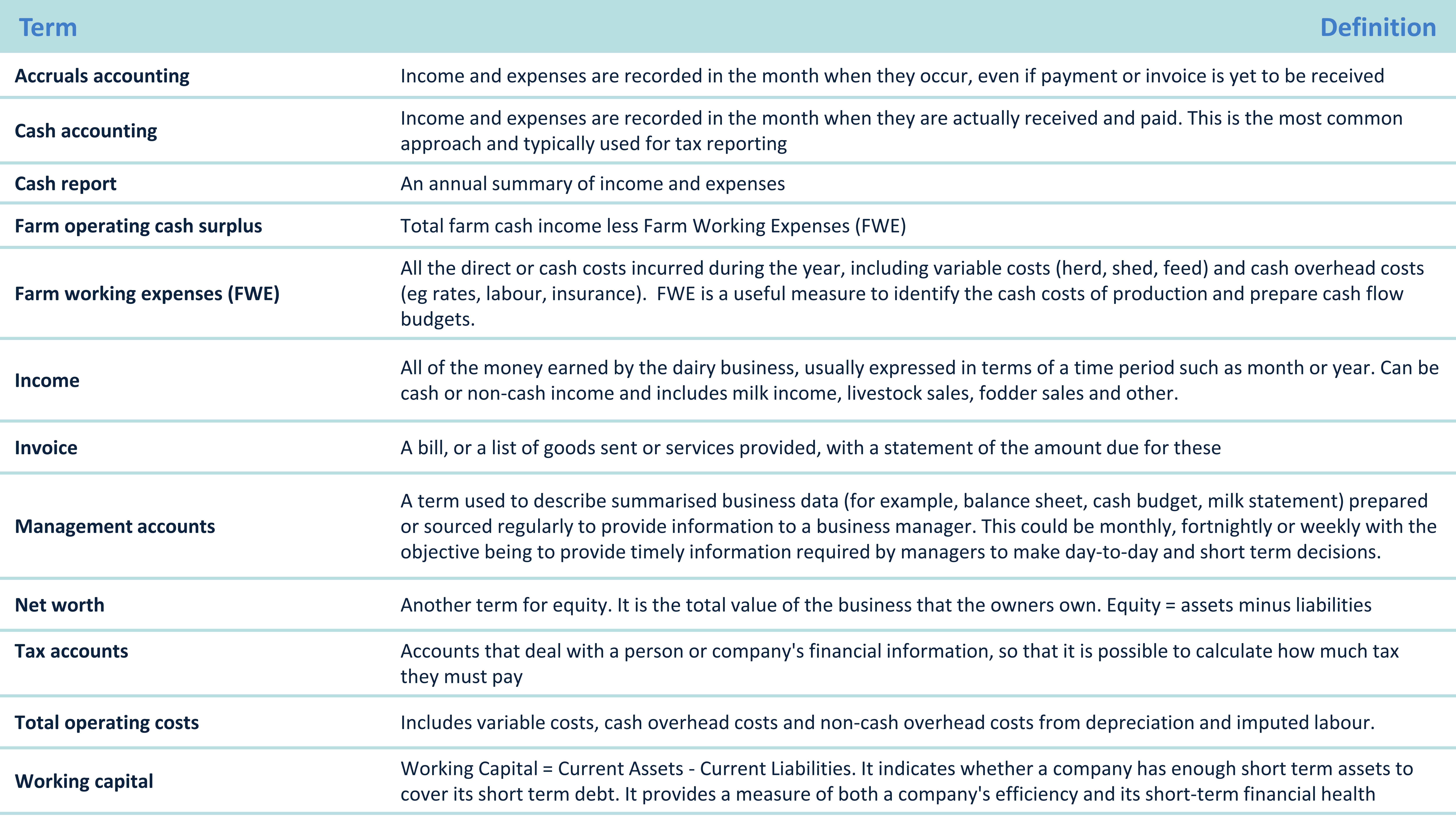 ‘Farm Business Fundamentals’ aims to provide participants with the skills and knowledge to implement farm financial practices and processes in a farm business. By adopting concepts such as Dairy Australia’s Standard Chart of Accounts and recording key physical and financial information participants will be able to prepare and organise information about their farm business, including an annual cash budget and a balance sheet.